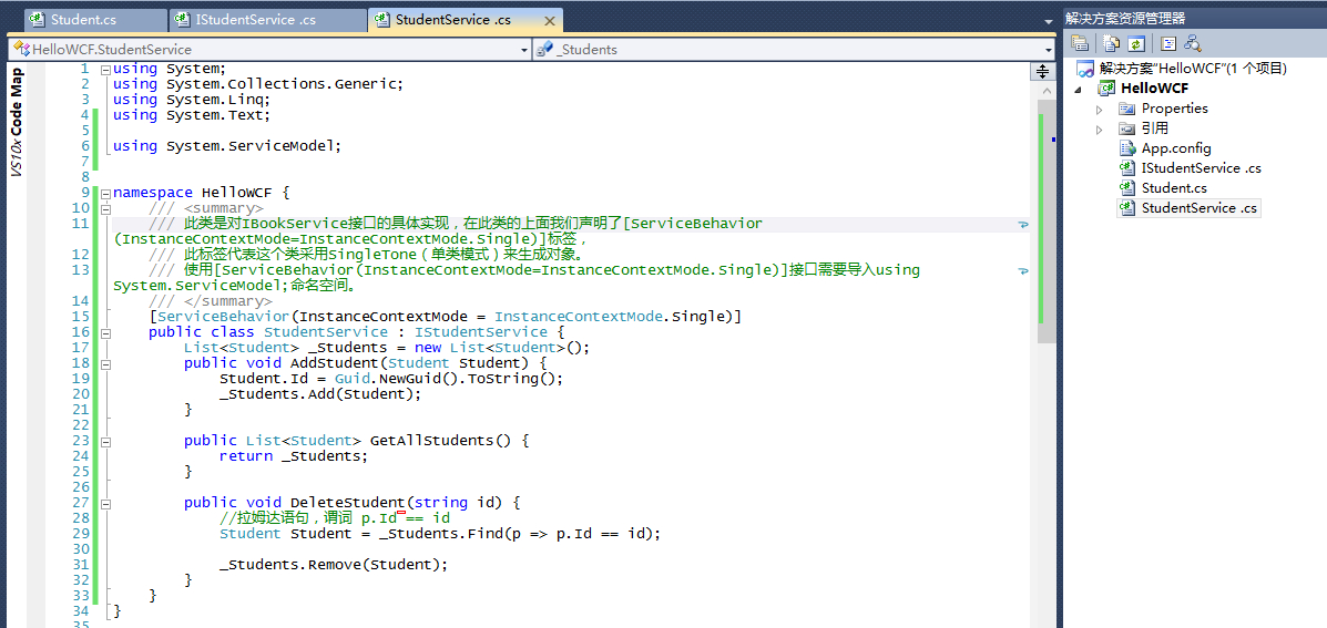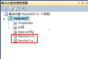在解决方案中会自动为我们生成两个类文件“IService1.cs”和“Service1.cs”。