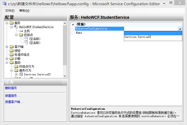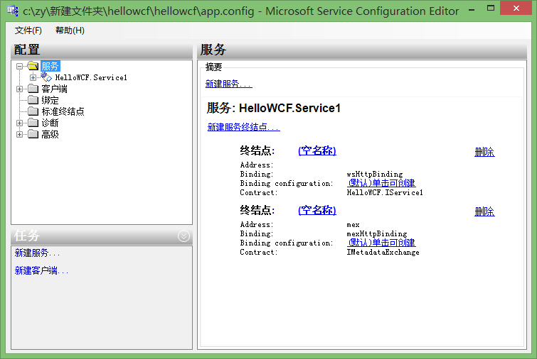 而另一个(即上面的终结点),是向外公布我们编写的[ServiceContract]的类,但我们可以看到它的Contract还是我们在第一步中删掉的HelloWCF.IService1这个终结点。