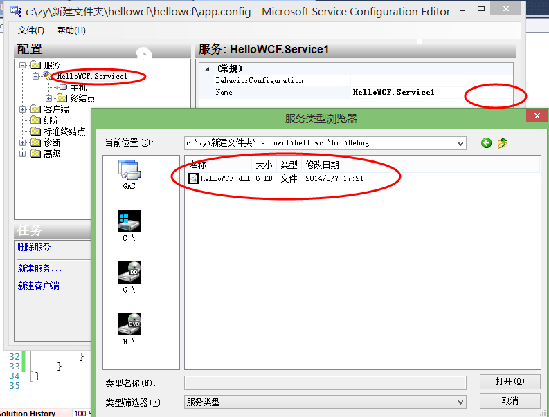 单击左侧的“服务”-“HelloWCF.Service1”在右侧的Name,弹出“服务类型浏览器”对话框,在此类型中我们找到此WCF服务项目编译出来的HelloWCF.dll文件,双击它就可以出现此服务中的对外公布的服务,点击选中它单击确定。
