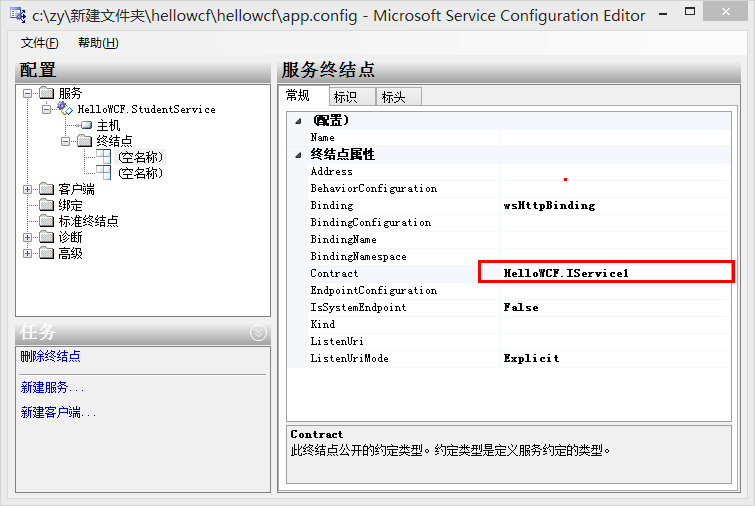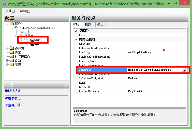 然后,我们展开左侧“服务”->“HelloWCF.StudentService”->“终结点”,单击第一个“空名称”,从右边的“终结点属性”中的Contract中我们可以看到,这里的Contract仍然用的是HelloWCF.IService1。
