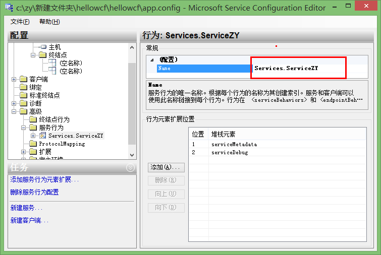 在高级目录树中,为服务行为配置命名,名字随便取。