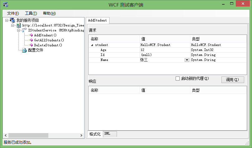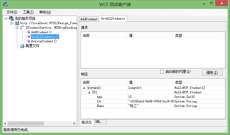 “测试客户端”从WcfSVCHost中取得WCF服务的元数据,解析为左侧的“服务结构树”,从这里面我们可以看到此WCF服务为我们提供了一个服务契约“IStudentService”,此服务契约中对外提供了三个可调用的方法。