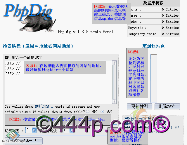 进入install.php后系统要求我们输入PHPdig管理用户名和密码,默认情况下均为admin,进入后出现如下界面(汉化后):