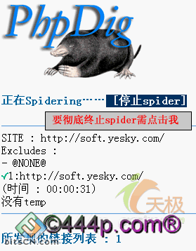 2)单击spider按钮,页面跳转到spider信息页面,程序开始自动spider站点http://soft.yesky.com的内容。