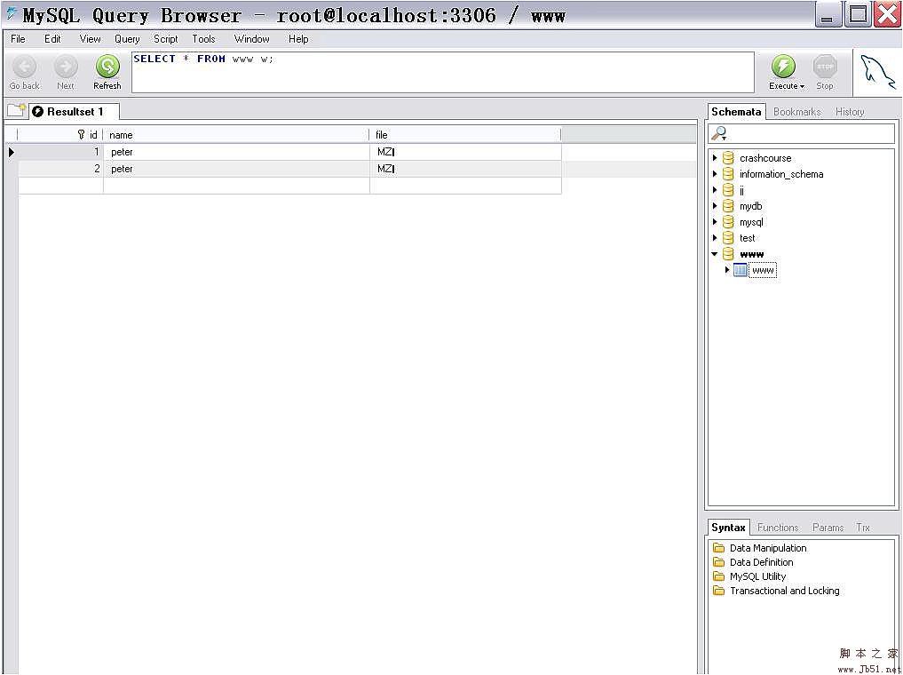 //在DBMS中线要创建数据库www,table www,file字段数据类型用LONGTEXT即可测试