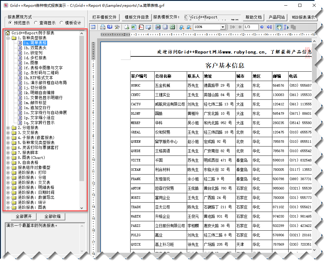 这个报表系统,报表模板提供了很多案例,我们可以大概浏览下其功能。