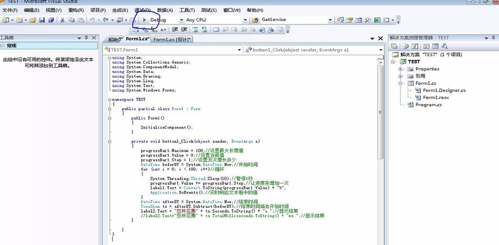 3、将需要计算执行时间的代码揽括在时间统计代码段内,如图所示:
