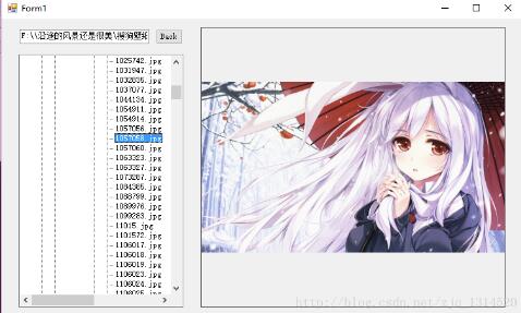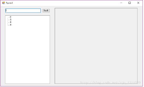 左边上面是一个 TextBox 和 一个 Button,分别用来显示当前路径以及返回上一个路径。左边下面是一个浏览文件的文件路径树状图(TreeView),用来显示当前路径下的文件和文件夹。右边是一个pictureBox,用来展示选中的图片。