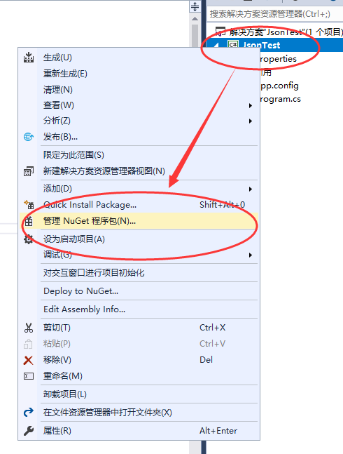 第一步:右键点击项目,选择“管理NuGet程序包”菜单