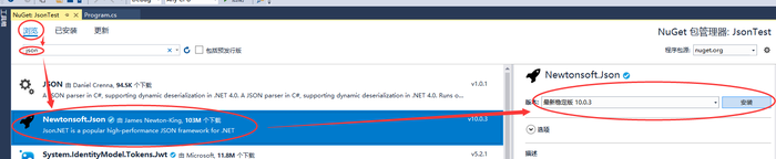 第二步:在"NuGet: JsonTest"选项卡中选择浏览,输入json后回车,选择Newtonsoft.Json,选择版本后点击安装按钮。