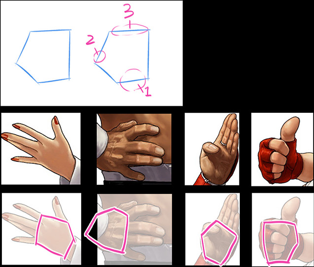 一般的情况和动作下,通常把A处的两个骨画出一体 ,也比较好把握和手的比例关系 。在一些特殊的手势,比如,握,还有表现力度的时候,会把指节都表现出来。