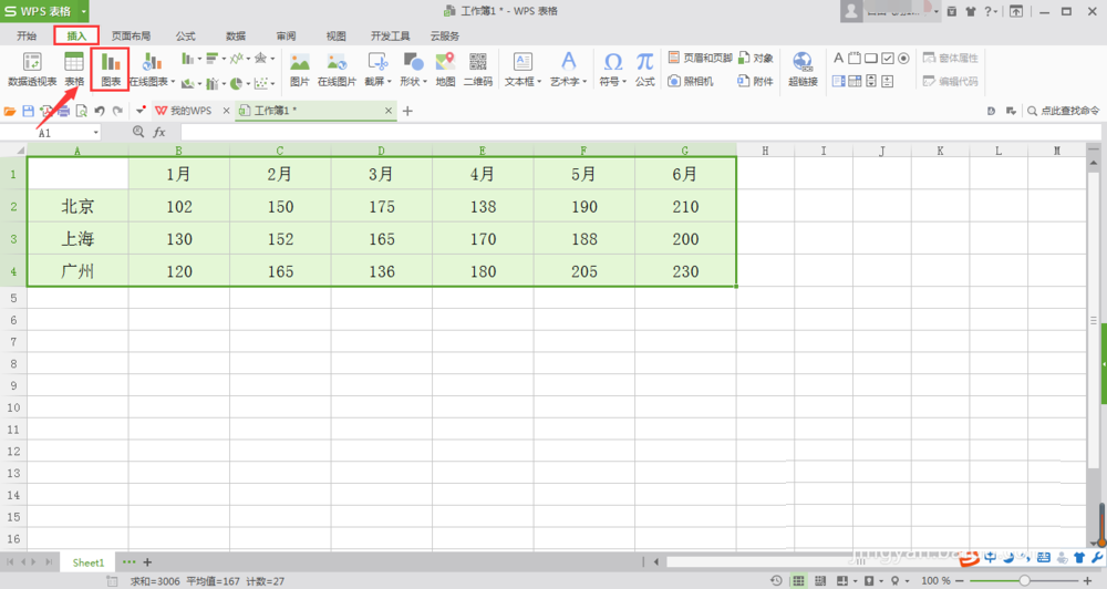 3、表格内容添加完毕之后,选定设计的表格,然后点击上方菜单栏里的【插入】菜单,在插入菜单内找到【图表】选项,如下图所示。