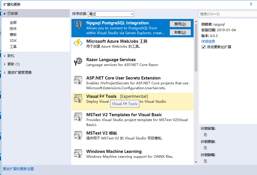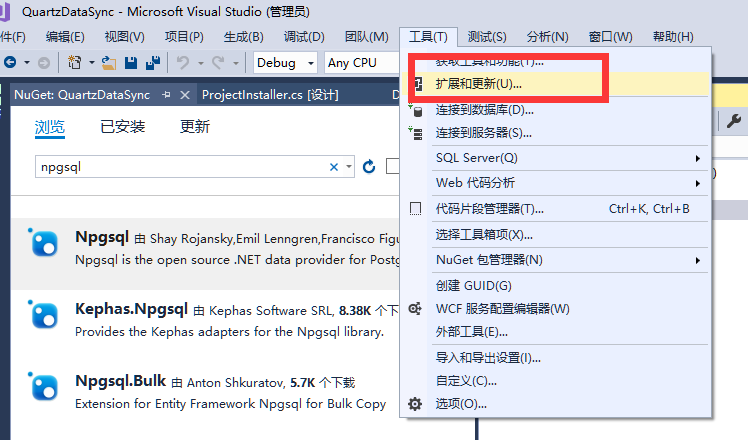 2.我们点击工具-->>扩展和更新 -->>安装PGSql所使用的扩展工具NPGSql PostgreSql Integration扩展工具。