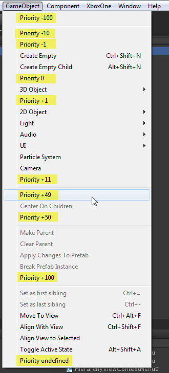 [MenuItem("GameObject/MyMenu/Do Something", priority = 0)]