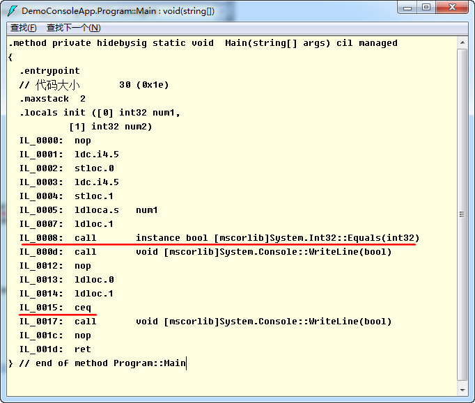 现在再来看看使用==运算符比较生成的IL指令: