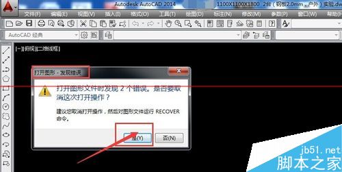 2、打开后 ,结果软件弹出打开图形,发现错误的页面提示,打开图形文件时发现两个错误,如果取消此次操作,那么就选择是