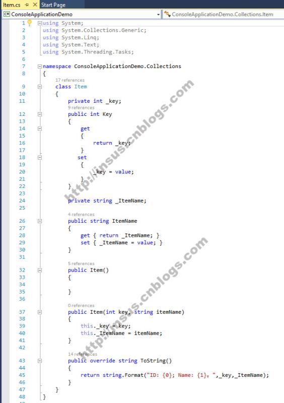 对象,即是网店的商品物件,Insus.NET只为其添加2个属性,物件的ID的Key和名称ItemName以及2个构造函数,最后一个方法是重写ToString()方法。