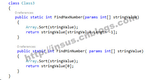 Console.WriteLine("Min: {0}",Class3.FindMinNumber(value));