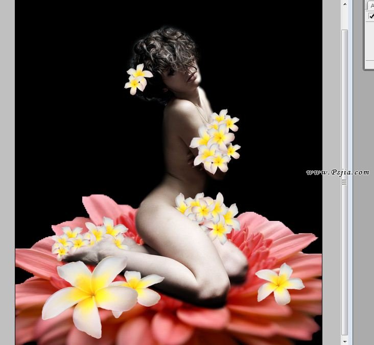 3.把人物放在花上。添加些阴影效果,让素材融合。
