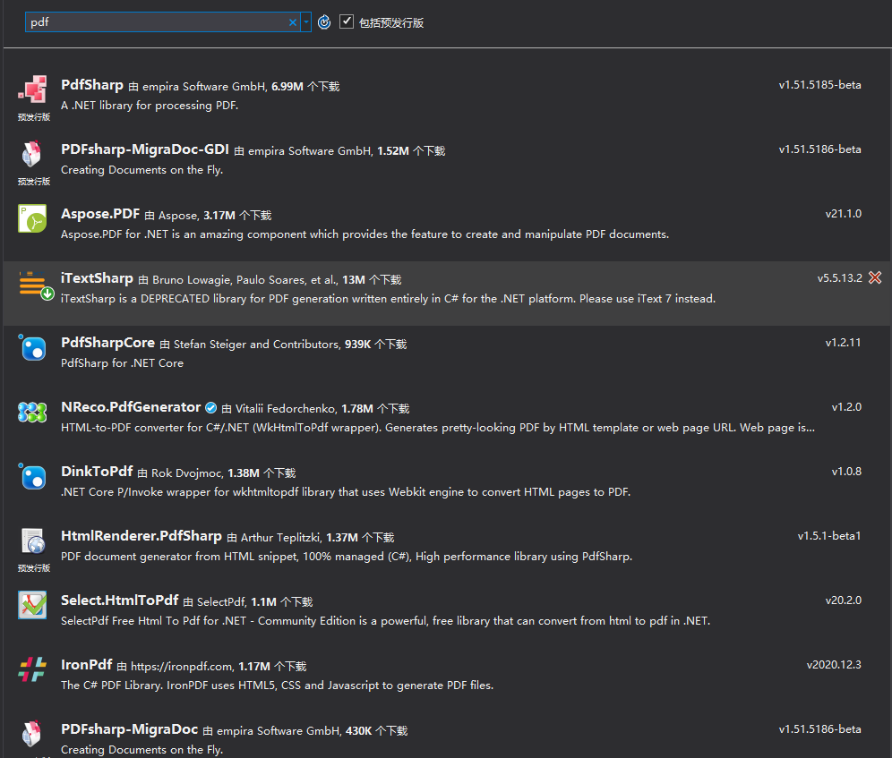 PDF文件使用了工业标准的压缩算法,易于传输与储存。它还是页独立的,一个PDF文件包含一个或多个“页“,可以单独处理各页,特别适合多处理器系统的工作。PDF文件结构主要可以分为四个部分:首部、文件体、交叉引用表、尾部。PDF操作类库非常多,如下图所示,常用的类库有:Spire.Pdf、iTextSharp。