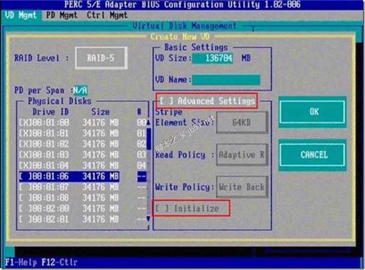 5、修改高级设置,选择完VD Size后,可以按向下方向键,或者Tab键,将光标移至Advanced Settings处,按空格键开启(禁用)高级设置。如果开启后(红框处有X标志为开启),可以修改Stripe Element Size大小,以及阵列的Read Policy与Write Policy,Initialize处可以选择是否在阵列配置的同时进行初始化。