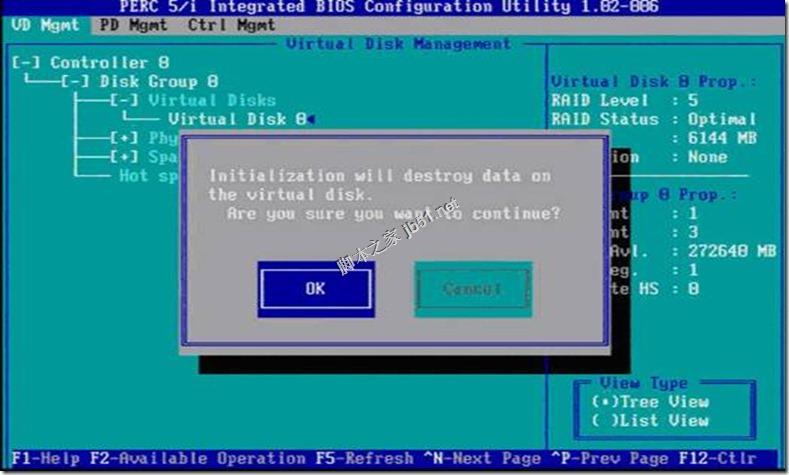 11、如果我们要对此虚拟磁盘进行初始化,可以将光标移至Initialization处,回车后选择Start Init。此时会弹出提示窗口,初始化将会清除所有数据,如果确认要进行初始化操作,在OK处按回车即可继续。