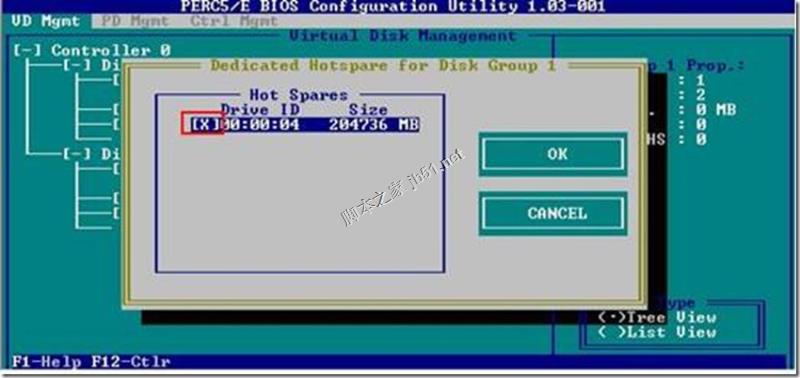 5、将光标移至需要移除的热备硬盘上,按空格键,去掉X标识,说明此硬盘被移除。将光标移至OK处回车,完成热备移除。