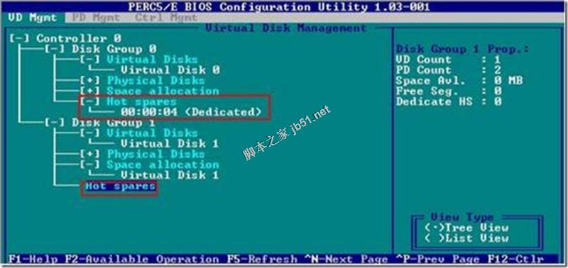 3、可以看到磁盘组0已经有了热备盘,并且是Dedicated。而磁盘组1并没有热备盘。