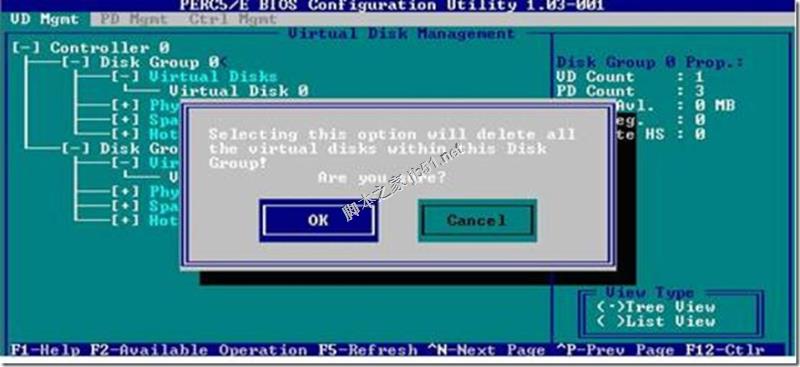 3、删除磁盘组,将光标移至要删除的磁盘组处,按F2,选择Delete Disk Group按回车继续