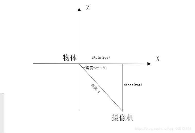 在xz平面中,设相机与物体的距离为d(就是上面说的那个d,distance映射在xz平面的长度),相机的旋转角度为rot。根据下图可以看到,相机与物体的连线与x轴的角度为rot-180.根据三角函数,既可以得出x轴的位移为d*sin(rot) ,z轴的位移为d*cos(rot) 。
