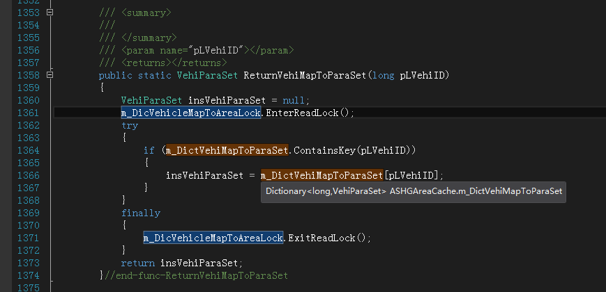 如下图所示,在读取前,执行EnterReadLock()进入读取锁定模式,读完后,执行ExitReadLock()退出读取模式。如果是要写入,则执行该锁定对象的EnterWriteLock()、ExitWriteLock()方法。这样实现锁定对象与字典的对应。