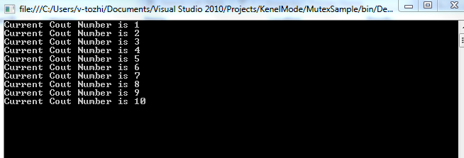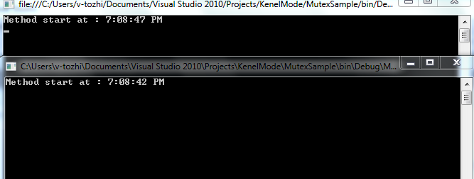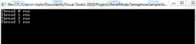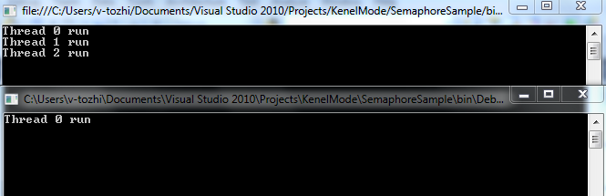 从运行结果中可以看出, 第二个进程值运行了一行语句, 因为我们设置的初始信号计数为4,每运行一个线程,信号计数通过调用WaitOne方法减1,所以第二个进行一开始信号计数为1而不是进程一中的4,如果我们把信号计数后面的name参数去除的话,此时第二个进程和第一个进程中的结果应该是一样的(因为此时没有进行不同进程中线程的同步)。