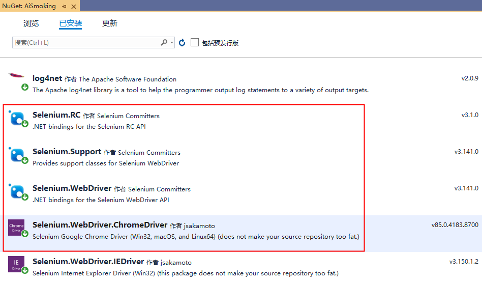 本例开发工具为VS2019,通过NuGet进行需要的软件包的安装与管理,如下所示:
