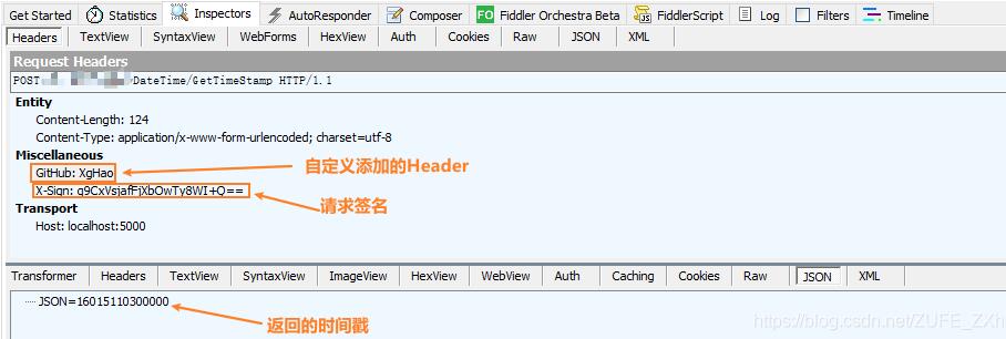 可以看到,我们的签名及我们自己加的其他Header,还有计算返回的时间戳。