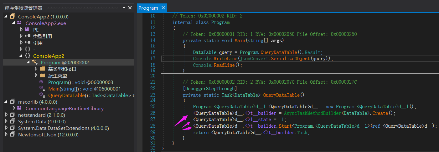 从 <QueryDataTable>d__1 类的命名格式: <QueryDataTable>d__ 来看,你点击 编译 按钮肯定是过不了编译器的。
