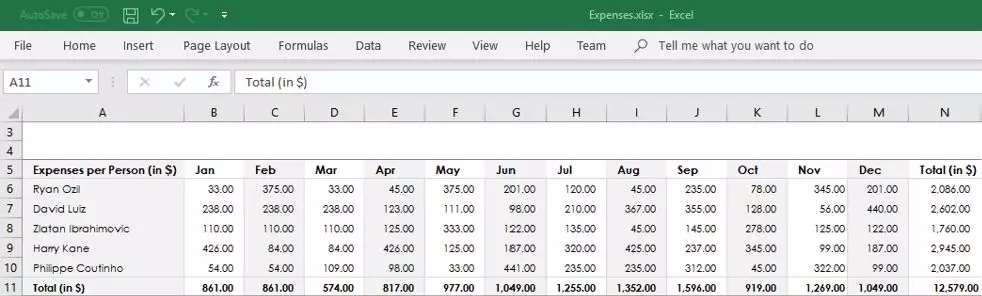 让我们考虑一个场景,“人均开支”。一个人全年的花费都列在 Excel 工作表中。在这个场景中,你需要在新建一行,添加一个新用户 Paul Pogba 的开销,并更新所有被跟踪人员 12 月的开销。