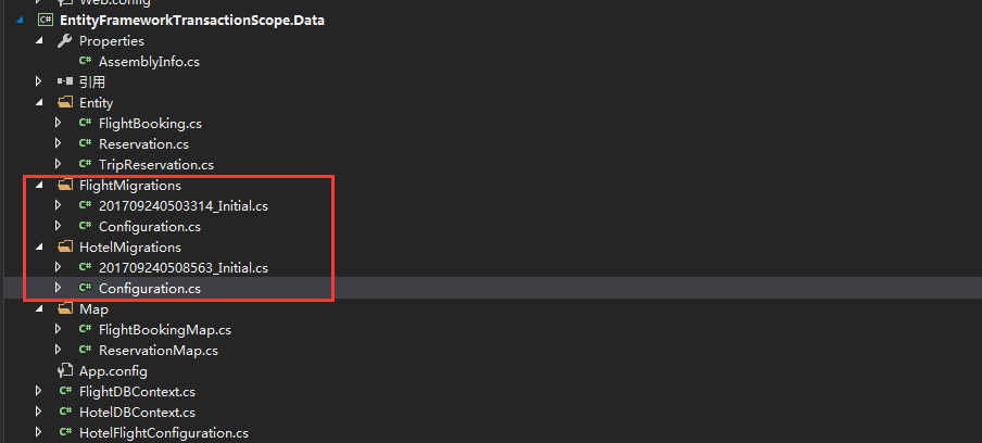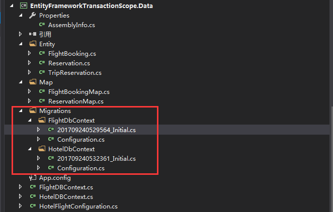 同理我们对HotelDbContext利用上述三步命令来进行迁移,最后我们能够很清晰的看到,每个上下文迁移在不同目录,如下: