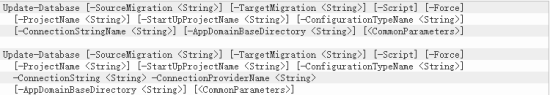 由于存在多个上下文,所以我们需要明确指定迁移哪个上下文。通过在其命令后继续添加-ContextTypeName指定上下文,并继续利用-MigrtionsDirectory指定迁移目录,最后则是如下命令(不知道有哪些命令吗,在每个命令后添加一个【-】横杆并按下Tab键则出现你想要的命令)。