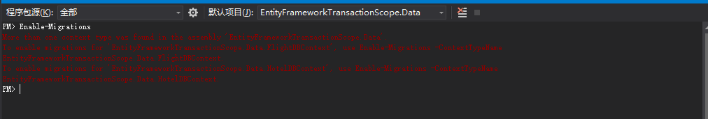 当统一应用程序只存在一个上下文时,我们只需要Enabel-Migrations即可,但是若存在多个上下文,若不明确指定上下文很显然会迁移报错,首先我们在NuGet控制台将项目更换到上下文所在项目中。