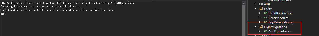 接下来利用Add-Migration命令对已挂起模型改变搭建基架,也就是说将上次迁移后我们对模型发生了更改,以此为下一次迁移搭建基架,此时生成的模型状态为挂起状态或者称作为待定状态。我们需要迁移上述生成FlightMigrations目录下的Configuration类,所以此时在Add-Migration命令后指定-ConfigurationTypeName,然后通过-Name指定第一次基架名称。