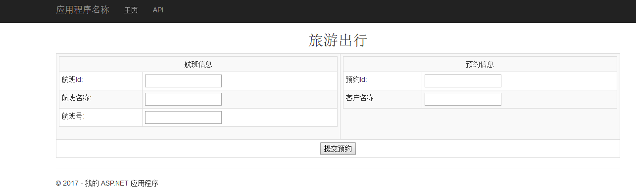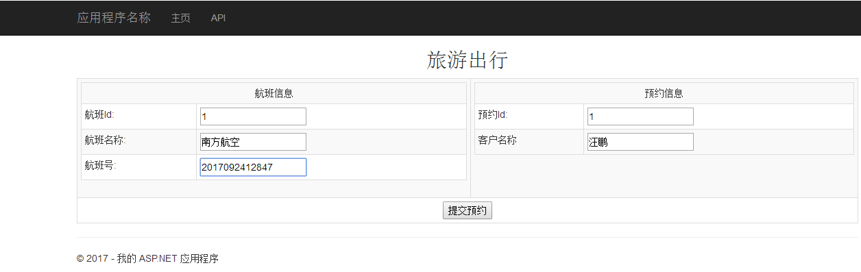 上述ReservTrip方法接受TripReservation对象。 该方法定义了TransactionScope,并在事务的上下文中捆绑了用于Flight和Hotel的Create操作,并将代码写入try-catch块中。 如果两个实体的SaveChanges方法成功执行,那么事务将被完成,否则回滚。接下来进行控制器调用。