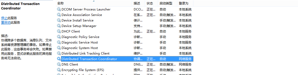 要运行应用程序并检查事务,我们需要使用分布式事务处理协调器(DTC)服务。 该服务协调更新两个或多个事务受保护资源的事务,例如数据库,消息队列,文件系统等。首先我们需要确保DTC是否已经开启,在服务中进行查看并启用。