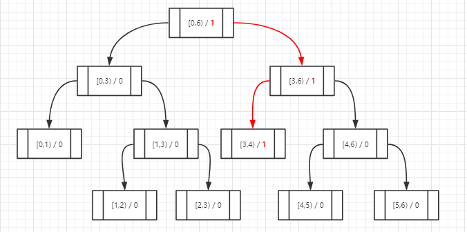 假如现在有一个积分3要插入到树中,该如何操作呢?当前节点从根节点开始,分别判断是否包含于左右子节点,如果包含的话当前节点改为这个子节点,同时计数器加1,然后再次进行相同判断,直到遍历到叶子节点为止,遍历顺序如下: