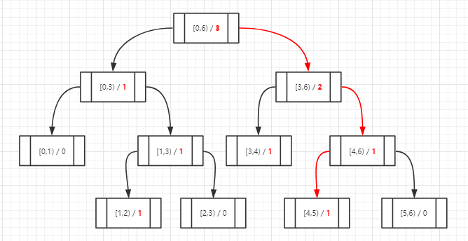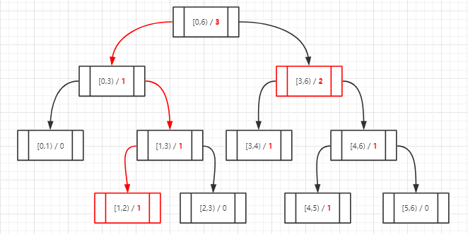 其中每个树节点包含2个信息:节点范围range[min,max) 和命中数量计数器count ,可以看到叶子节点的range一定是相邻的2个数。