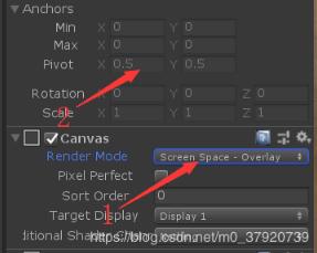 最近一直在倒腾用UGUI做虚拟摇杆,网上普遍的的做法就是使用以下的代码,但是这个有些注意事项,第一点就是Canvas的Render Mode必须是Screen Space Overlay,第二点就是挂载这个脚本的锚点的x,y必须是0.5,如图下: