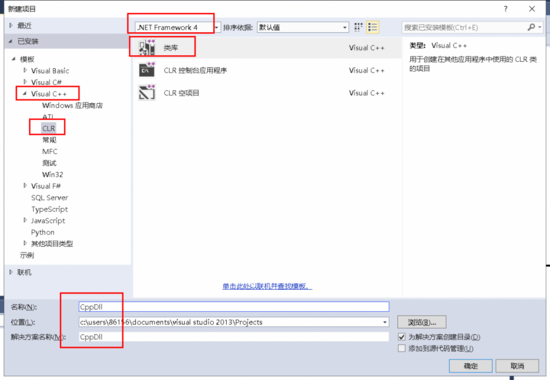 5、关闭CSharpDll项目,另外新建一个C++ CLR类型的Class Library项目(选择与C#项目相同的.Net Framework 4),项目名称为CppDll。