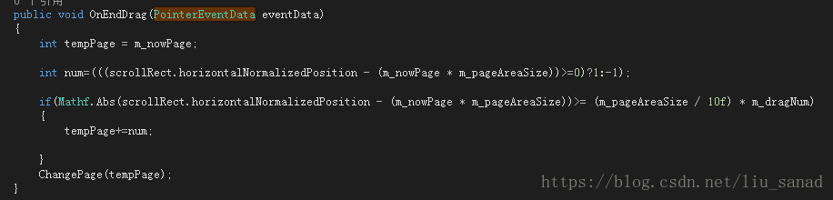 if(Mathf.Abs(scrollRect.horizontalNormalizedPosition - (m_nowPage * m_pageAreaSize))>= (m_pageAreaSize / 10f) * m_dragNum)