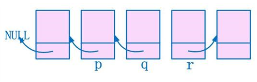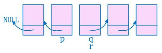 使用p和q两个指针配合工作,使得两个节点间的指向反向,同时用r记录剩下的链表。