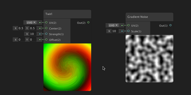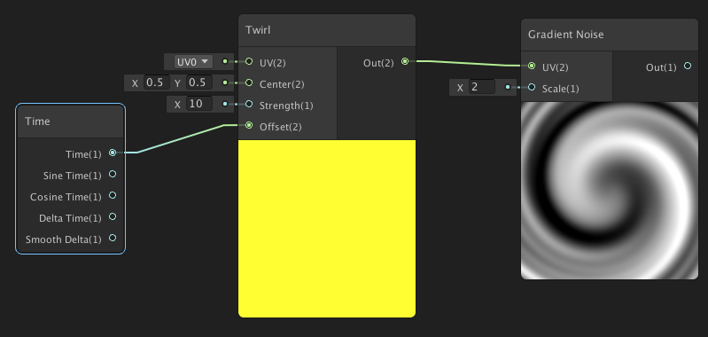 通过Twirl 旋转节点对Gradient Noise 梯度噪声节点进行操作,就可得到一个旋转的旋涡效果。