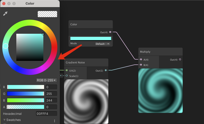 创建“Color”颜色节点 和 “Multiply”乘法节点,我们将“Gradient Noise”节点的输出 和 “Color”颜色节点的输出都连接到“Multiply”乘法节点的输入上: